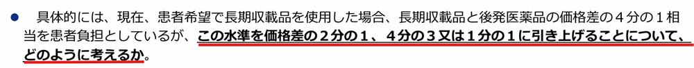 上図の通り、現状でも多くの長期収載品が選定療養の対象薬剤となっていますが、更にその範囲を拡大することが検討されています。