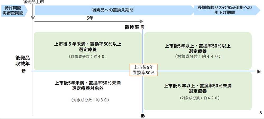 現在は、後発医薬品が上市(発売)されて5年以上、もしくは、後発医薬品への置換率50%以上のどちらかを満たすと原則として選定療養の対象になります。
