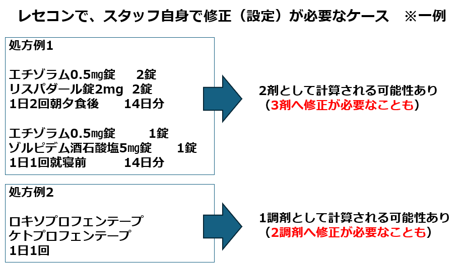 このようなケースでは、レセコンで正しく計算出来ない可能性があり、かつ、本来算定出来る点数の算定漏れにつながることもあります。
