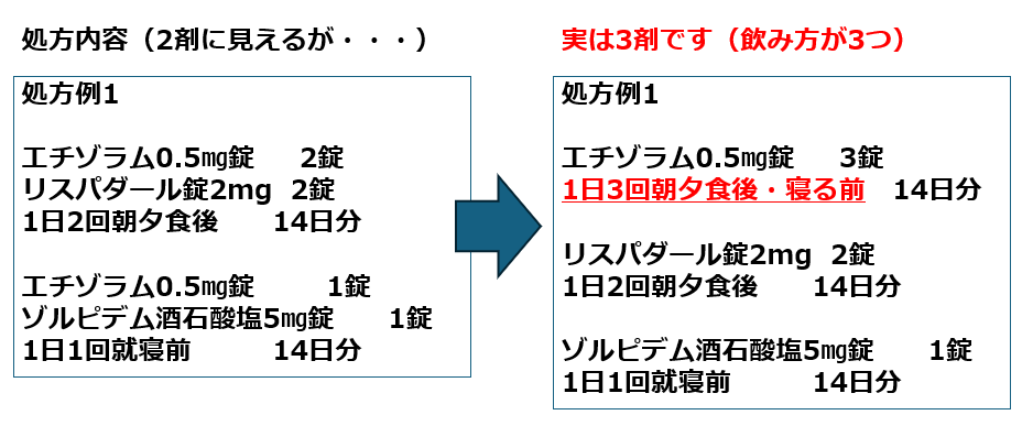 1剤とは「1つの飲み方」のことです。つまり、例えば飲み方が3つあれば、その処方は3剤となります。具体例でみていきましょう。