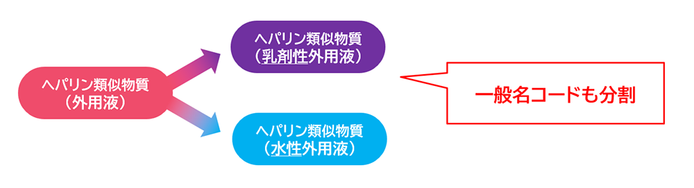 2025年8月に新しい一般名処方マスタ(一般名コード)が適応になり、「ヘパリン類似物質」のローション剤は「ヘパリン類似物質外用液0.3%(乳剤性)」と「ヘパリン類似物質外用液0.3%(水性)」の2つに分割されることになりました1)