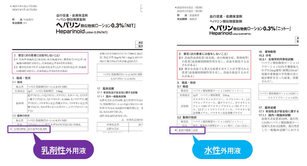 「ヘパリン類似物質」外用液が「乳剤性」か「水性」かは、添付文書を見ればわかる